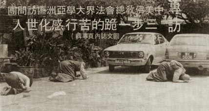 恒实比丘、恒朝沙弥实行他们的宏愿“三步一跪拜”,