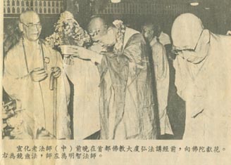 宣化老法师(中)前晚在首都佛教大厦弘法讲经前,向佛陀献花。