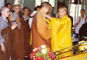 住持寂晃法师前来欢迎,为上人挂上茉莉花环套。