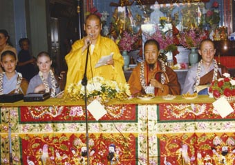 于妙应寺欢迎茶会中,住持寂晃法师致欢迎词。