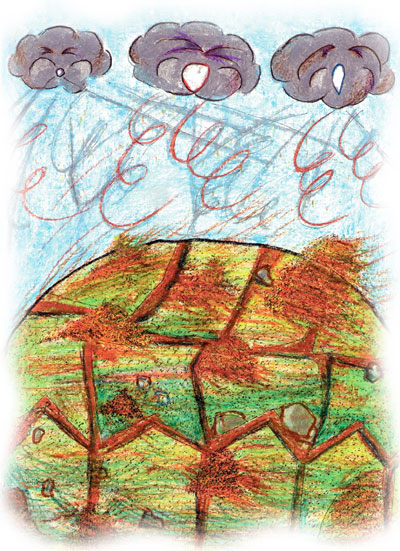In the mornings, the winds came up, blowing tiny grains of sand onto the turtle's back. Whoo-sha! Whoo-sha! The grains of sand joined together forming mountains and valleys.