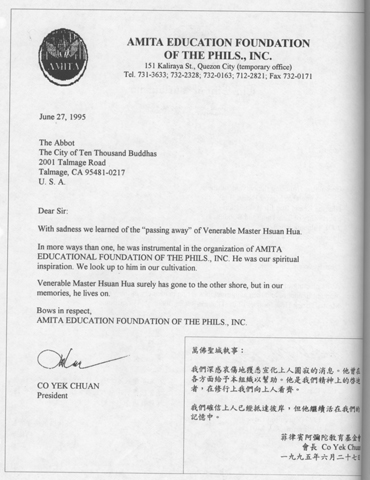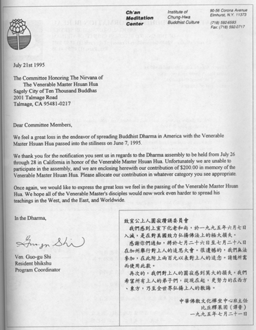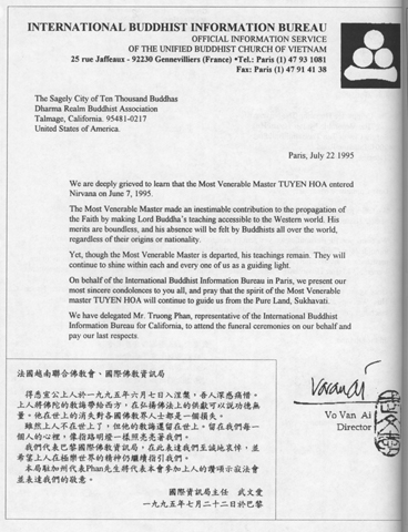 得悉宣公上人于一九九五年六月七日入涅盘,吾人深感痛惜。上人将佛陀的教诲带给西方,在弘扬佛法上的供献可以说功德无量。他在世上的消失对各国佛教界人士都是一个损失。