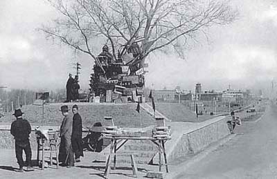 【后记】1958年9月,长春“孝子坟”因阻碍交通,被长春市政府拆除。王梦醒和其母亲的遗骨被迁葬他处。时隔50年后的2008年9月9日,“孝子坟”在长春息园公墓以1:1的比例复建完成。旧照片中有树的地方,即是“孝子坟”。