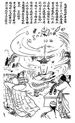 When the offering was over, he returned to the temple, pelted by torrents of rain.