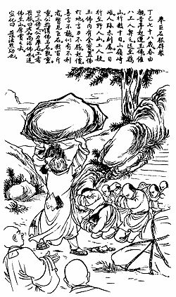 The Master's seventy-eighth year was 1917. In the spring, eight workers were hired to transport the jade Buddha from Kuan Yin Pavilion to Chicken Foot Mountain in China, a journey of quite a few days over treacherous mountain paths and places where no people had previously gone. One day while passing through Yeh Jen (Wild Men) Mountain, the workers got the idea that there were gold and gems inside the Buddha, which they consequently refused to carry further, saying that they had no strength to do so. They raised their fee and would not listen to reason, as if someone were taking advantage of them. The Master noticed a boulder of several hundred pounds to which he pointed and said, "Is this rock not heavier than the Buddha?" The workers agreed that it was two or three times heavier. The Master then raised the boulder over his head, and the workers were completely awed. They said, "This Venerable Master is a living Buddha!" They carried the Buddha image through the mountains and were generously rewarded by the Master upon arrival at their destination.