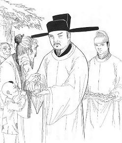 名仲淹,字希文,北宋江苏吴县人。幼孤家贫,事母至孝。读书于长白山之礼泉寺,偶见窖金,不动声色,覆之不取。后贵时,对僧言此事,取金建寺。才高志远,力学不倦,以天下为己任,言:“士当先天下之忧而忧,后天下之乐而乐。”宋仁宗时为相,上十事疏,改革政治,惜被旧派反对,国之不幸。母卒,请僧诵功德经超荐,孝心感应观音助念,藉菩萨力,其母生天。因之,笃信佛教,好善乐施。置义田,济族人;舍新房为学舍,施旧宅为天平寺。临终时对家人云:“昨梦池中莲华皆金色,我当归矣!”寂然而逝,年六十三,谥为文正,后人称为范文正公。