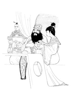 于是就把吕布找来吃饭,叫貂婵出来给唱歌、敬酒之类的。吕布一看这个女人就迷了,就欢喜、就中意这个女人了。王允一看他中意,就把貂婵许配给他,说送给他。那么送给他以后,又请董卓来吃饭,也是叫貂婵出来给他跳舞、唱歌、敬酒,这么来招待他。王允就说这是他的女儿,董卓一看,也就迷了,被貂婵给迷住了,迷住了也就欢喜。欢喜嘛,王允就说把这个女儿送给他了。那么送到他家里,这个吕布,方才周老师已经讲过了,他以为这个干爸爸给他娶媳妇,就高兴得不得了。等到拜堂的时候,原来是给这个董卓,吕布这时候就很不高兴。不高兴,因为是他义父,他也没有办法,董卓有权力,﹁既在屋檐下,焉敢不低头﹂呢!于是就忍着,忍着。
