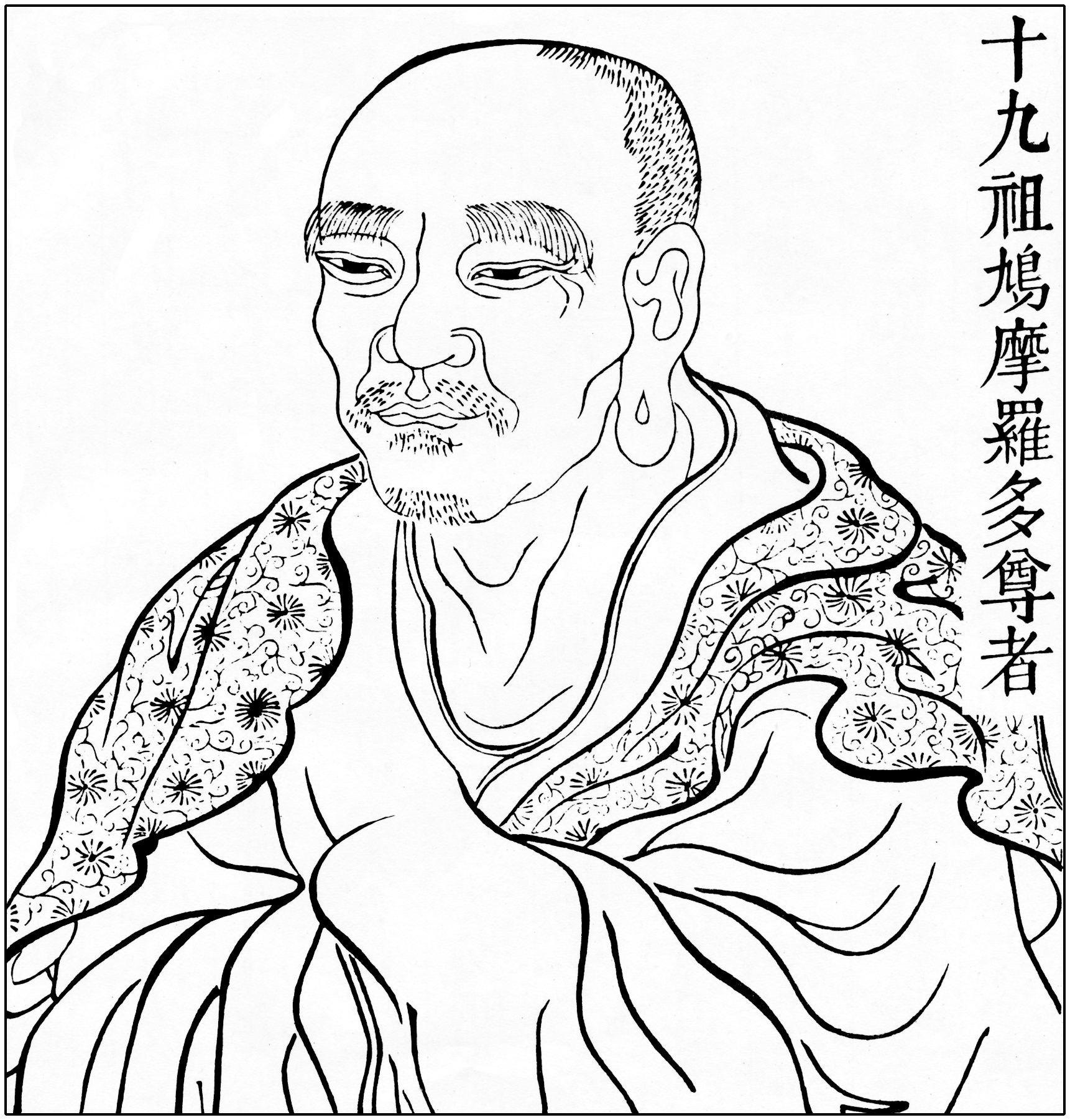 尊者。迦毗罗国人。父名梵摩净德。家有园树。生耳如菌。味甚美。唯净德与次子罗睺罗多得取而食。随取随长。因十五祖至其家。曰。汝年八十一。此树不生耳。净德闻。弥加叹服。且曰。弟子衰老。不能事师。愿舍次子。随师出家。祖曰。昔如来记此子。当第二五百年。为大教主。今之相遇。盖符宿因。即与剃度。执侍。后付以大法。得法已。行化至室罗筏城。转付与僧伽难提。即安座归寂。