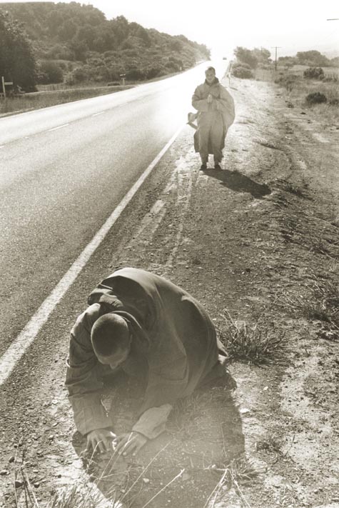 恒实、恒朝两位行者,为祈求世界永久和平, 于1977年5月,从南加州洛杉矶金轮寺沿途三步一拜, 朝礼至北加州万佛圣城。全程八百余英哩, 经过两年零六个月的时间,终于1979年11月抵达万佛圣城。 他们的精进,感动无数的人发菩提心,进而学习佛法。
