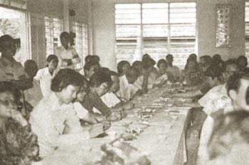 在怡保的欢迎茶会中,各报记者正在纪录上人的开示。