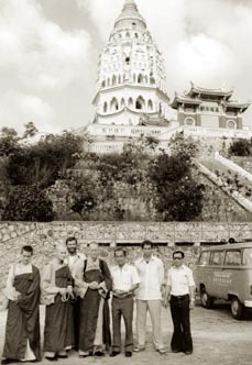 访问团与谢其华居士合影于槟城极乐寺万佛宝塔。