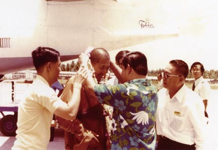 东马.吉兰丹州首府.哥打巴鲁机场。 黄逢保居士等数十位信众为上人献花环。