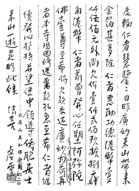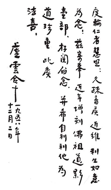 睽离忽已数载,每以为念。前郭居士来函云及座下在港法化甚盛,至慰!顷广东太平莲舍转来惠函,并惠港币陆百元,欣悉一一。座下发心殊盛,重兴古刹,并蒙远注,惠施功德,不胜希有之叹。云来云居结茆,已将三载。此亦为国内著名祖师道场,惟久已荒芜,殿堂全墟。云来此后,各地衲子亦闻风而至;因此前年勉建法堂一幢,容众安居。今春正修建大殿天王殿等处。惟资力维艰,住众逾百,道粮亦困难。座下法缘至广,甚望力为惠助,成兹功德,则甚幸!所云造圣像十余尊,此皆殊胜之业;至为云造象一节,云何以堪,此甚不可也!望勿尔!座下为法心切,续佛祖慧命,当满座下之愿。附寄源流,俾承祖脉,祖道赖以重兴,是所至望!专覆不尽,即颂