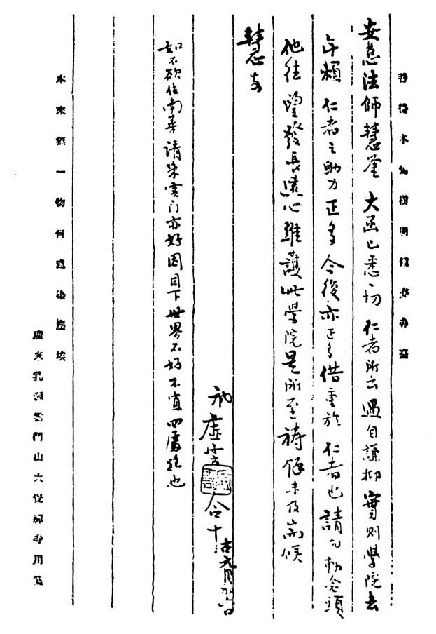 昨接手书,敬悉。大法全提,何分畛域,人寿十岁,我拟来此扶达磨刹竿;释迦儿孙者,只行真行,任何在所不辞。请放心!