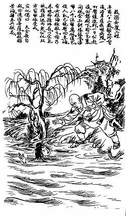 In 1921, the Master's eighty-second year, Ku P'in Chen was the governor of Yunnan Province. During that year a flood, a drought, and a diphtheria epidemic followed in close succession, and all progress was slowed considerably. One day, when the Master was resting under a tree on his way back from the city, he found and opened a package. It contained gold and jade bracelets, a watch as well as eight thousand Yunnan dollars, and over ten thousand dollars in French francs among other things. Closing the package, he waited for the owner to come and claim it. But since it was late, he decided to return the next day. Upon reaching the lake, the Master saved a girl who had cast herself into the water. The girl later revealed that her name was Chu, and that she had married an army commander named Sun. Because she had been mistreated, she had fled with her valuables and belongings. The Master converted the families of both the husband and wife, transmitting to them both the Refuges and Precepts.