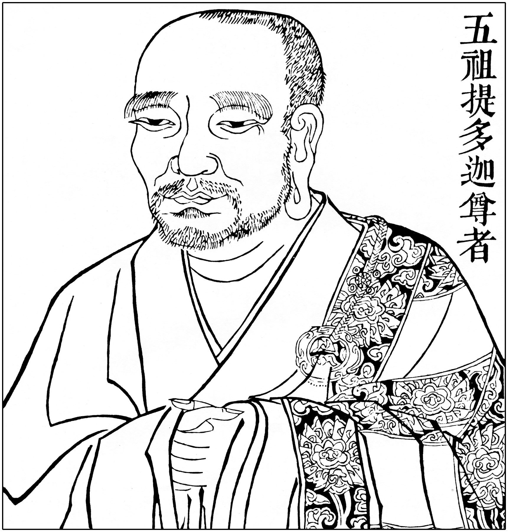 尊者。提伽国人。年已五十。口未尝言。足未曾履。一日。见八祖所说。真吾弟子。尊者即起礼拜问曰。父母非我亲。谁是最亲者。诸佛非我道。谁是最道者。祖曰。汝言与心亲。父母非可比。汝行与道合。诸佛心即是。尊者闻偈已。便行七步。祖曰。此子昔曾值佛发愿。虑父母难舍。故不言不履耳。长者遂舍出家。祖乃薙落授具。付以大法。尊者得法已。至中印土行化。转付法于难生。即入灭尽三昧。而般涅槃。