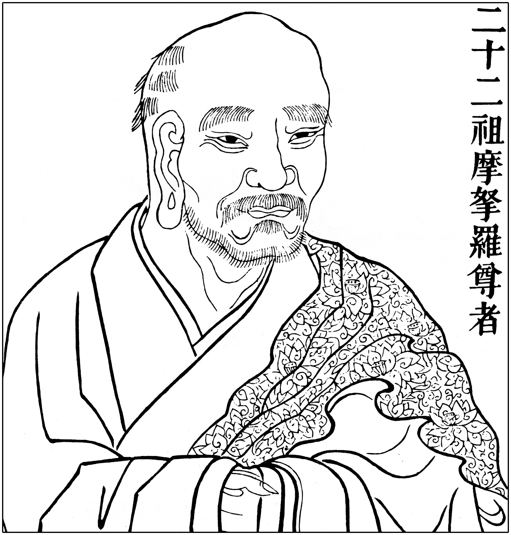 尊者。东印土人。因国王与不如密多祖。同车而出。尊者稽首于前。祖曰。汝忆往事否。答曰。我念远劫中。与师同居。师演摩诃般若。我转甚深修多罗。今日之事。盖契昔因。祖乃谓王曰。此子非他。即大势至菩萨是也。后南印土国王。一日请尊者。斋次。王问。诸人尽转经。唯师为甚不转。尊者曰。贫道出息不随众缘。入息不居阴界。常转如是经。百千万亿卷。非但一卷两卷。后转付菩提达摩。两手各放光明。化火自焚。