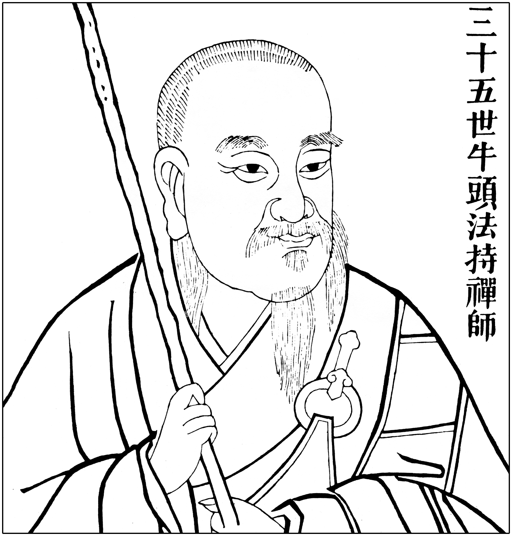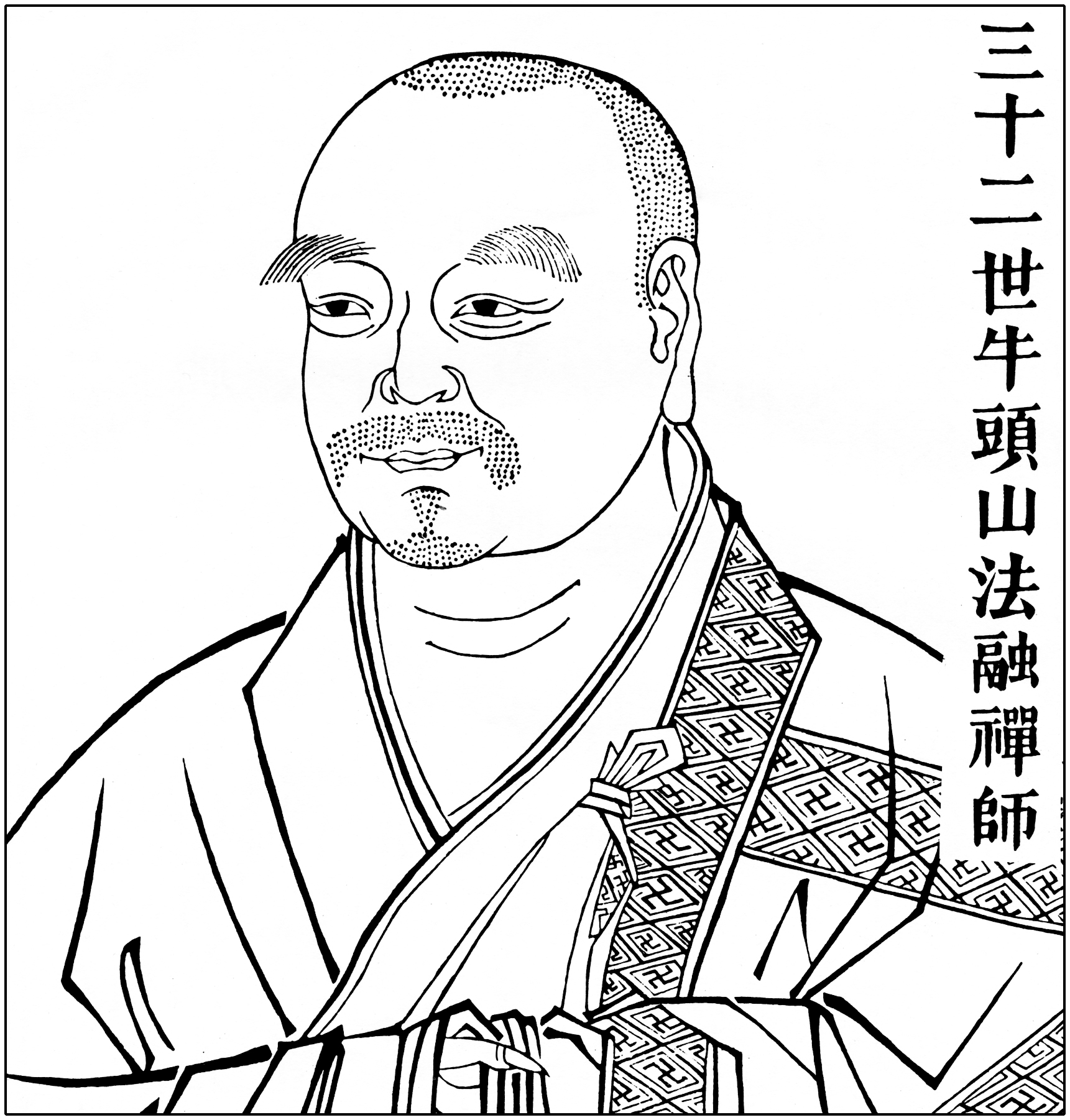 师。润州韦氏子。年十九投茅山落发。后入牛头山北岩之石室。静坐观心。适四祖踵至。问曰心是何物。师无对。遂延祖入庵。祖见虎狼围绕。作怖畏势。师曰。犹有这个在。祖于师座上书一佛字。师竦然不敢坐。祖曰。犹有这个在。师乃稽首请益。祖为说法要。且曰。吾受灿大师顿教法门。今付于汝。绍汝元化。自尔法席大盛。后得上首。付嘱法印。明年正月十三日。不疾而化。